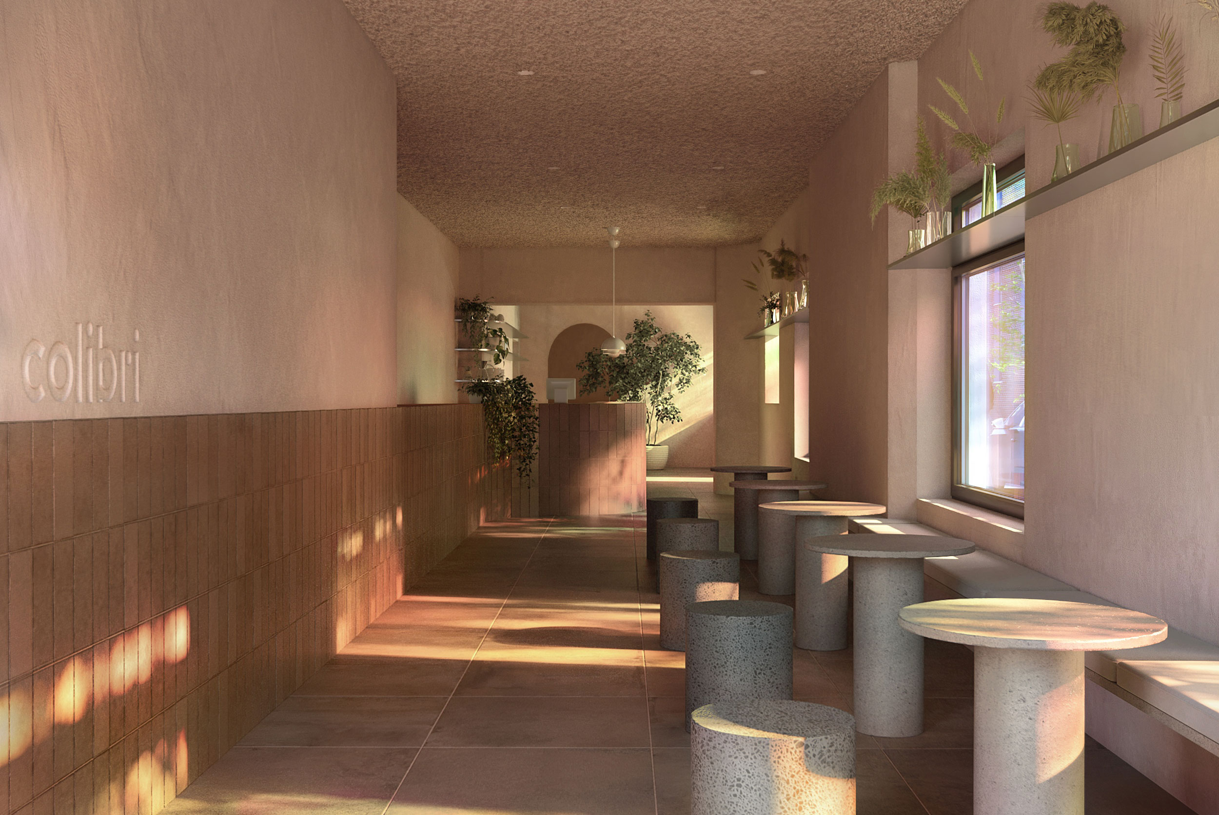 Nous avons choisi un ton de pêche pour les murs et les plafonds texturés évoquant l’artisanat et le toucher humain. Pour compléter cette atmosphère rosée et pour honorer le colibri, oiseau duquel découle le nom du restaurant, une pellicule iridescente dorée est appliquée sur toutes les fenêtres. Alors que des passants sont divertis par cette façade réflective curieuse, une aura aux teintes de pêche se révèle au travers des rayons de soleil qui infiltrent l’espace.