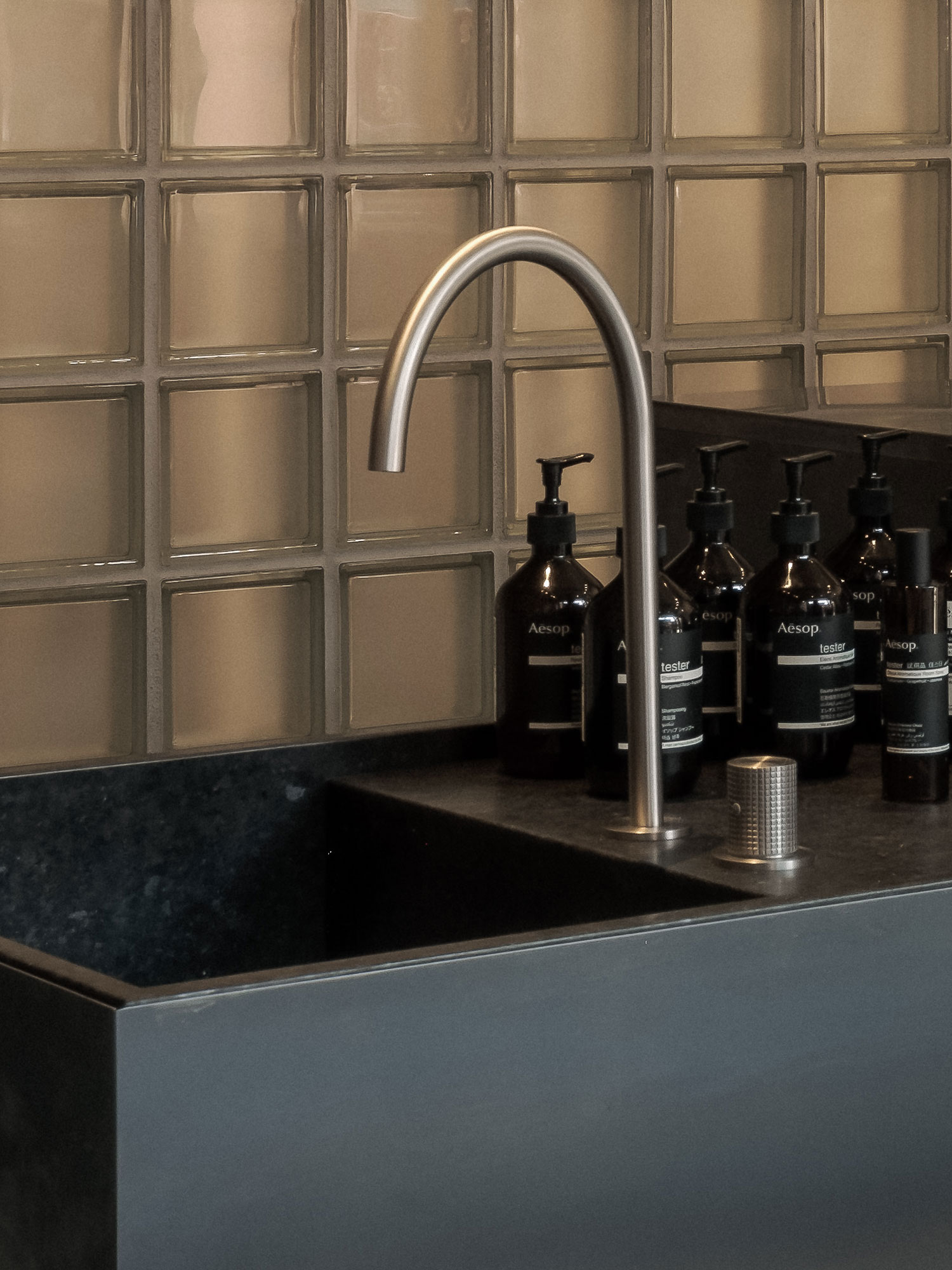 The unique experience at Recess is enhanced by their product partnership with Aesop. Ritual and scent are woven throughout the journey, with Aesop products thoughtfully integrated to complement the atmosphere and design language. While waiting, clients can sample products at the integrated custom designed sink, set against stainless-steel shelving that recalls the purity of clinics and the reflective depth of water — echoing the understated elegance of both brands