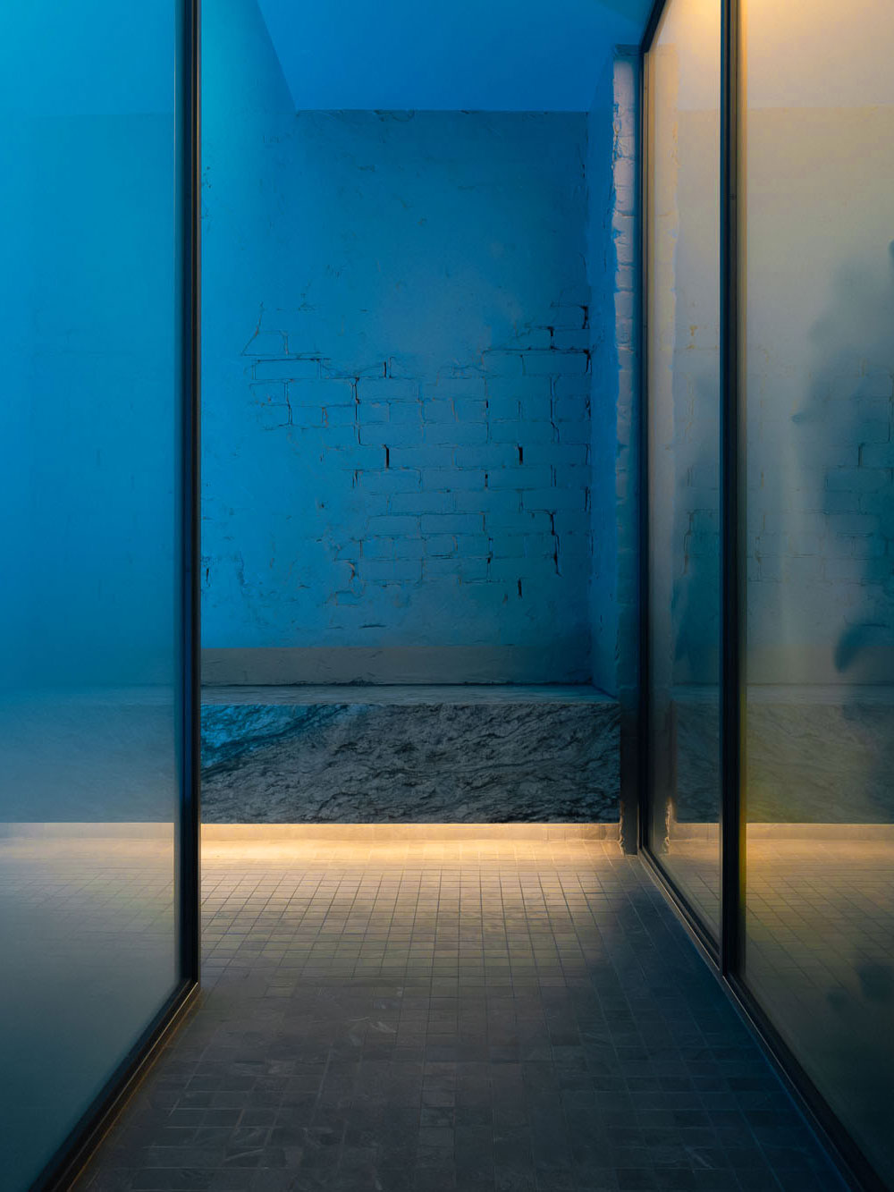 After emerging from the plunge, the body’s heart rate slows and circulation recalibrates, triggering the release of endorphins and reducing inflammation — physiological responses known to boost recovery, elevate mood, and strengthen the immune system. Visitors are then invited to gather in the lounge space, passing through a corridor of frosted glass panels that diffuse the light into a soft, ethereal glow.