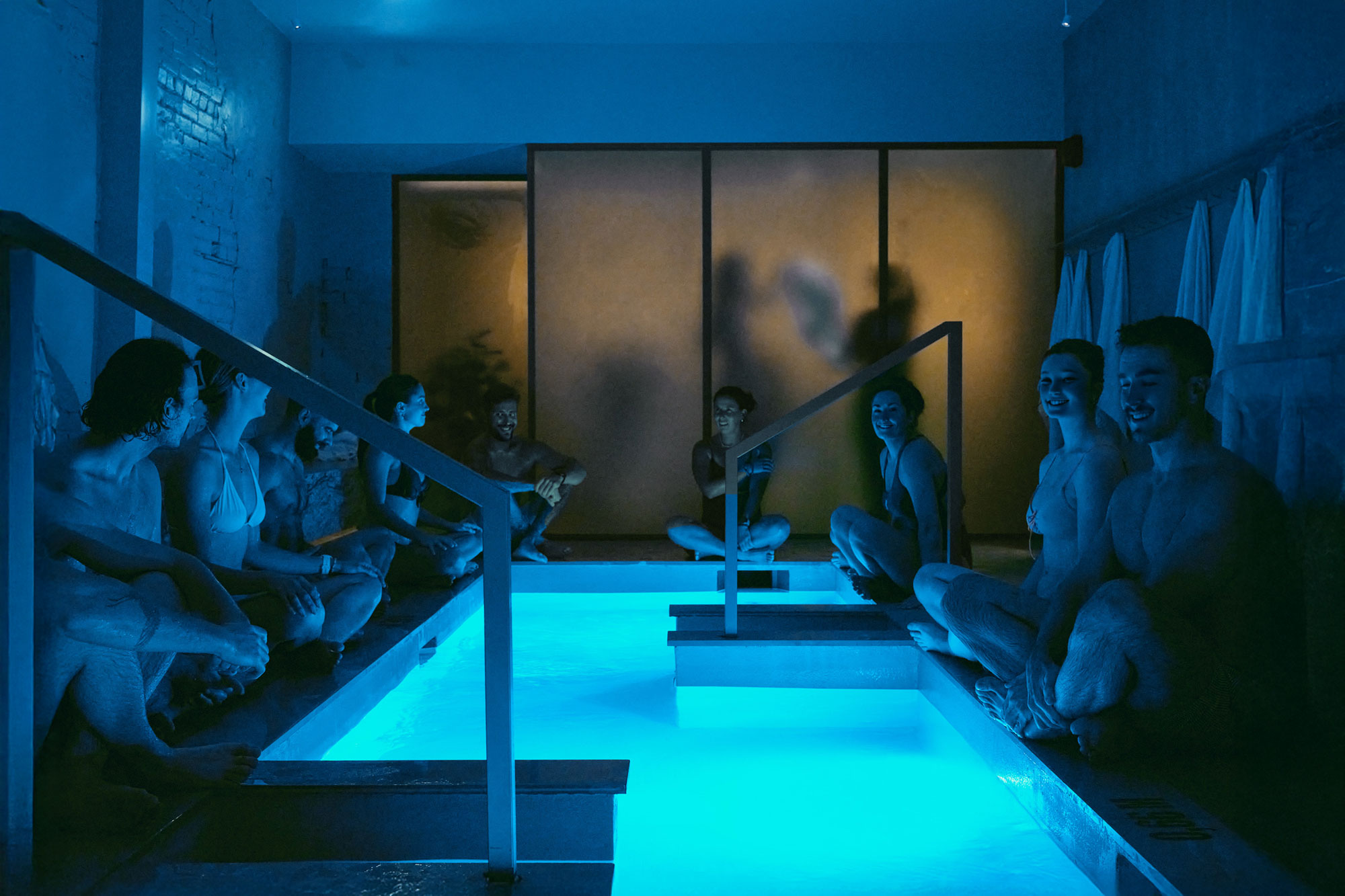 Unlike traditional single-person tubs, our approach imagines a unique custom cold-plunge pool that invites groups of twelve to submerge together in a shared bath beneath cool blue light — a visual and sensory reflection of the plunge itself. Natural stone slab benches heighten the atmosphere, grounding the body in contrast and renewal.