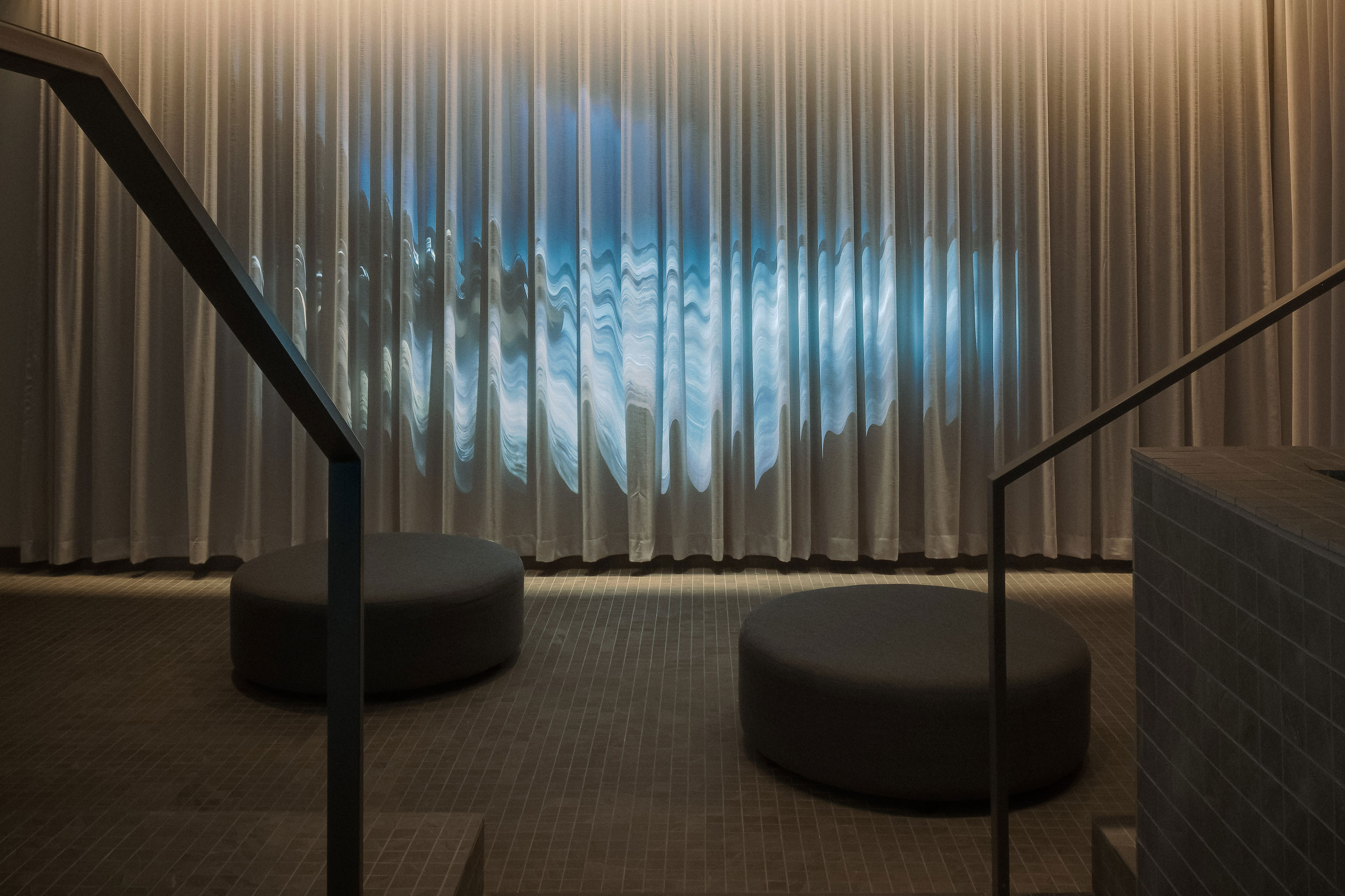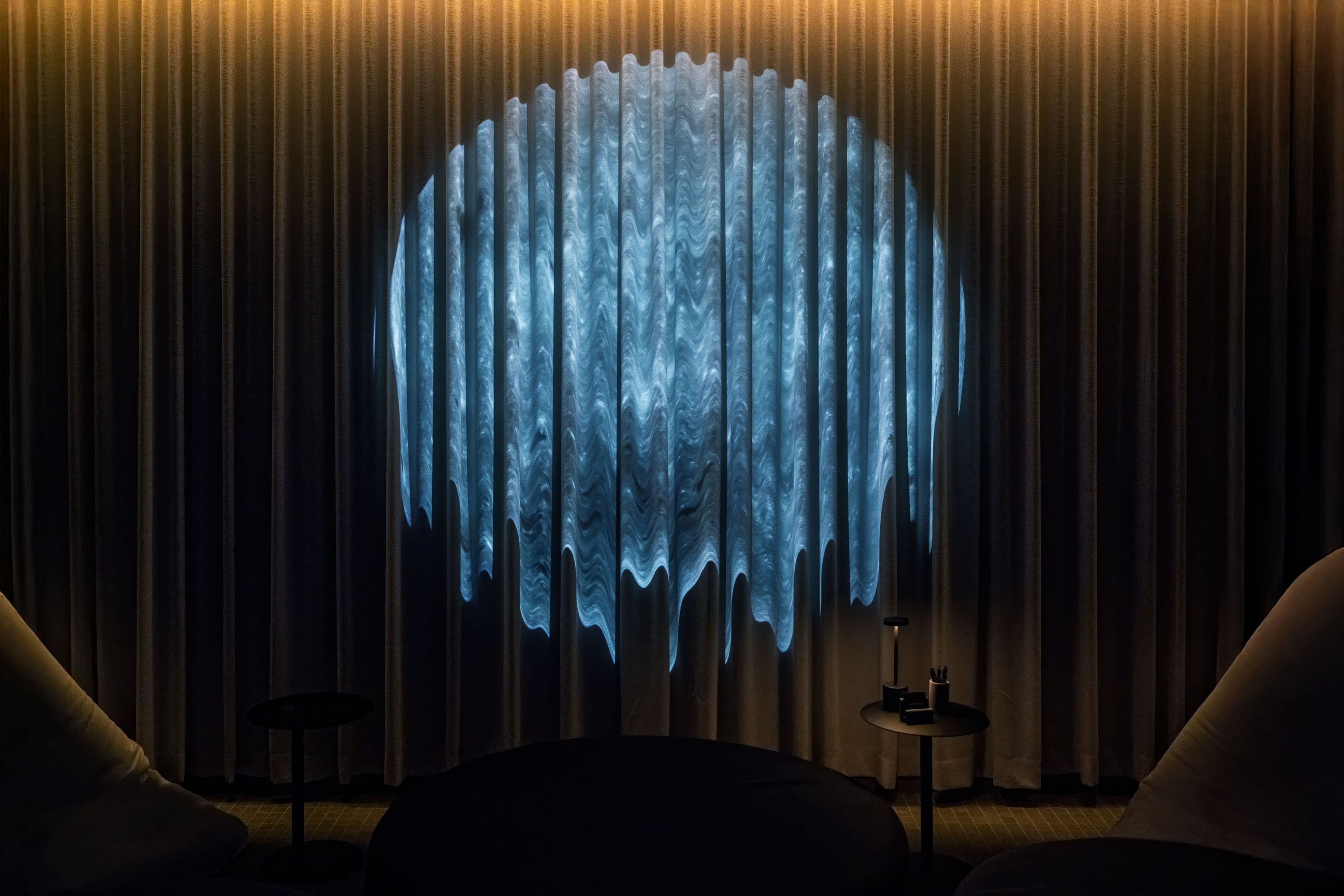 Beyond lies a cocoon-like room encircled by layers of curtains that act as a canvas, receiving and reflecting projection, transforming the space into an alternative screening room. This multipurpose lounge was designed to host Recess’ rotating program of immersive art installations, DJ sets, and guided breathwork sessions, extending the sensory contrast into the realm of sound, movement, and community.