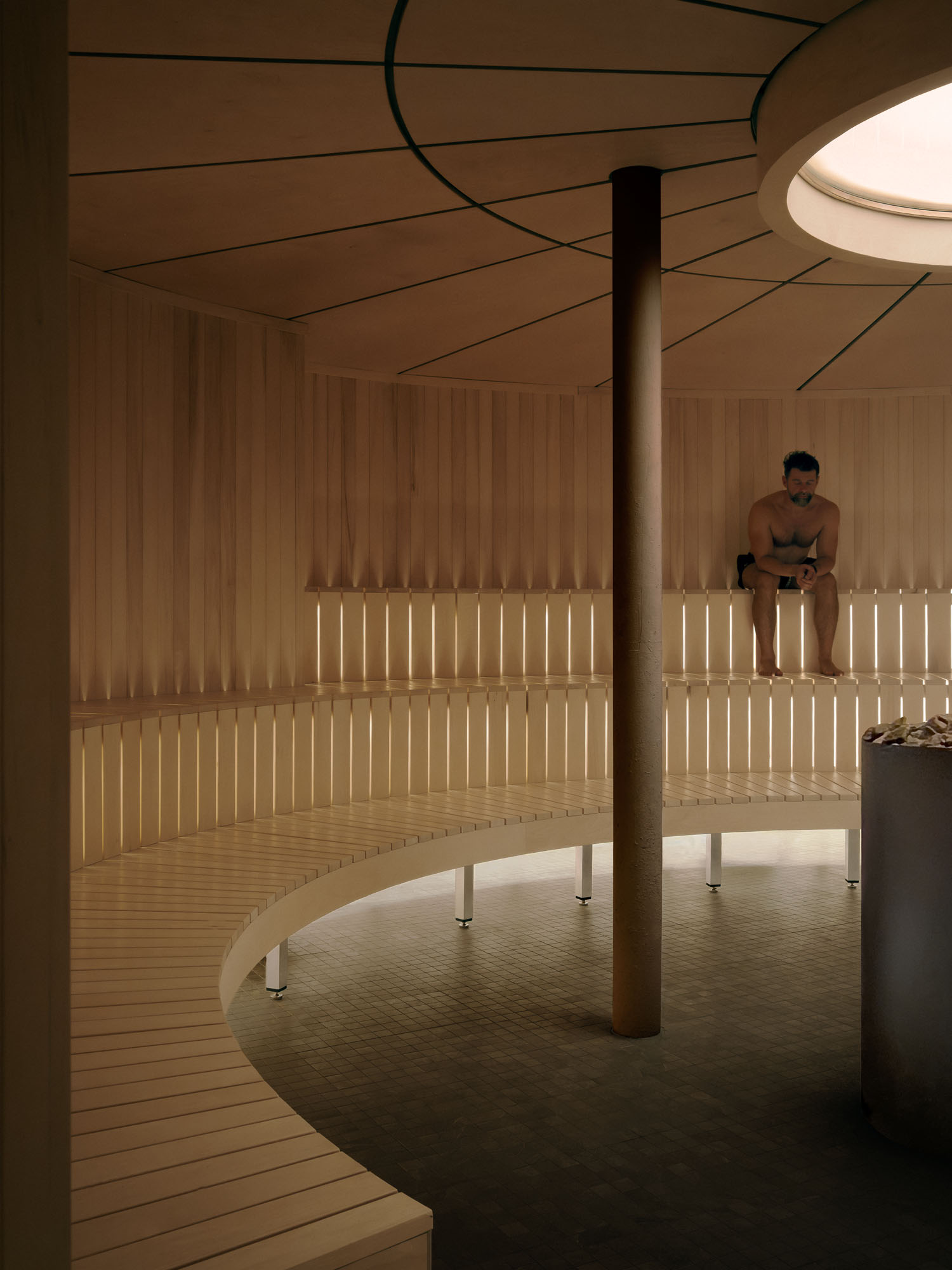 Emerging from the locker rooms, visitors are immediately enveloped in warm, moody oak tones and golden restorative light that define the sauna zone. At its center sits a custom, 50-person circular sauna designed in collaboration with Sauna Concept — a sculptural cylinder seemingly dropped into a rectangular volume, its monumental radius allowing for guided group sessions. Performative in nature, these communal gatherings are actually transformative moments where one is encouraged to breathe, connect and feel with other people. Surrounding the sauna, stone benches invite conversation, while a tea station offers hydration and quiet reflection before the next phase of the circuit.